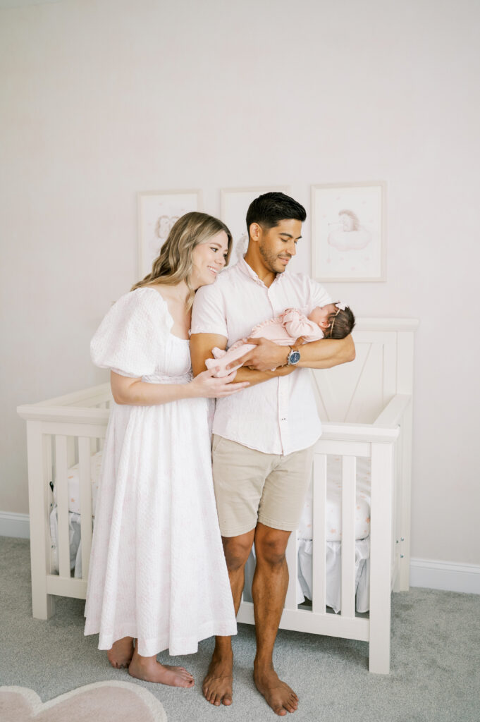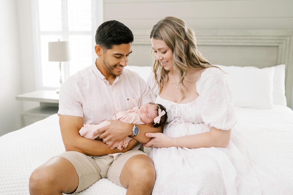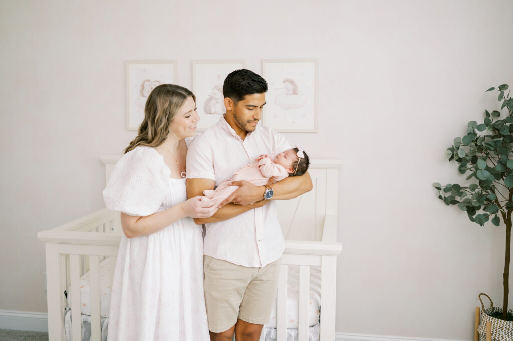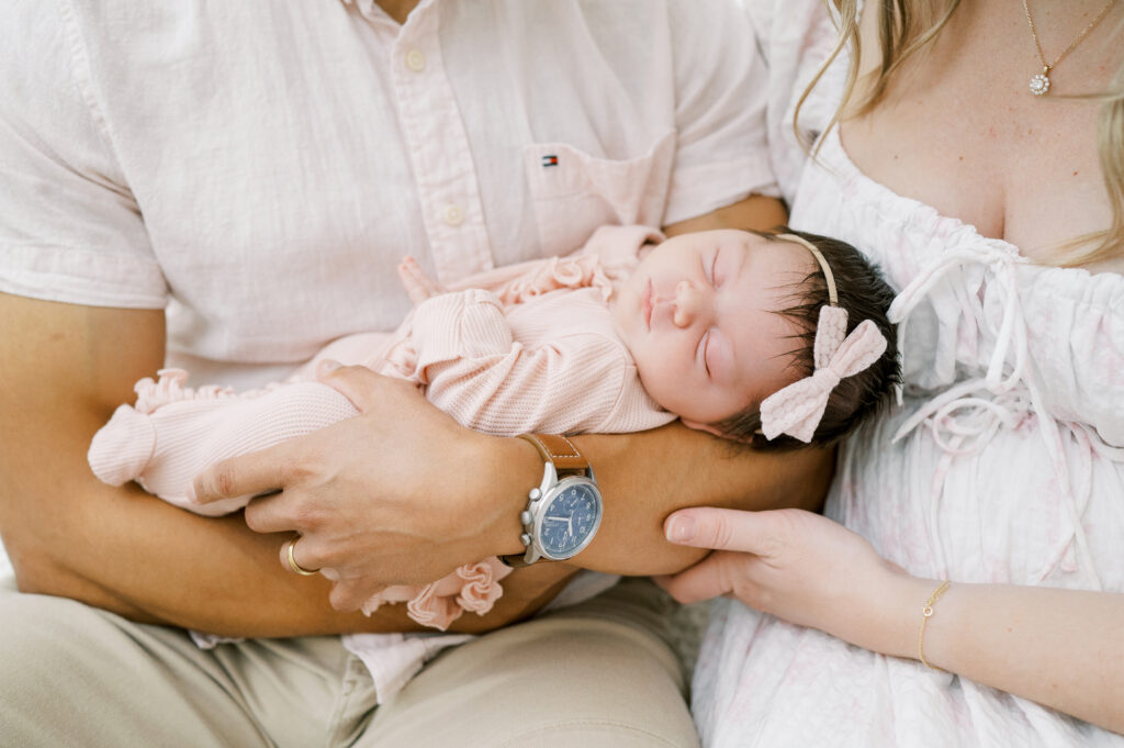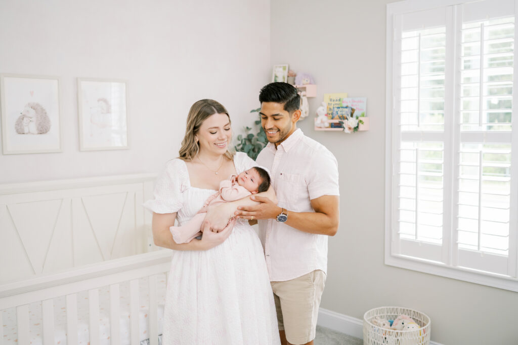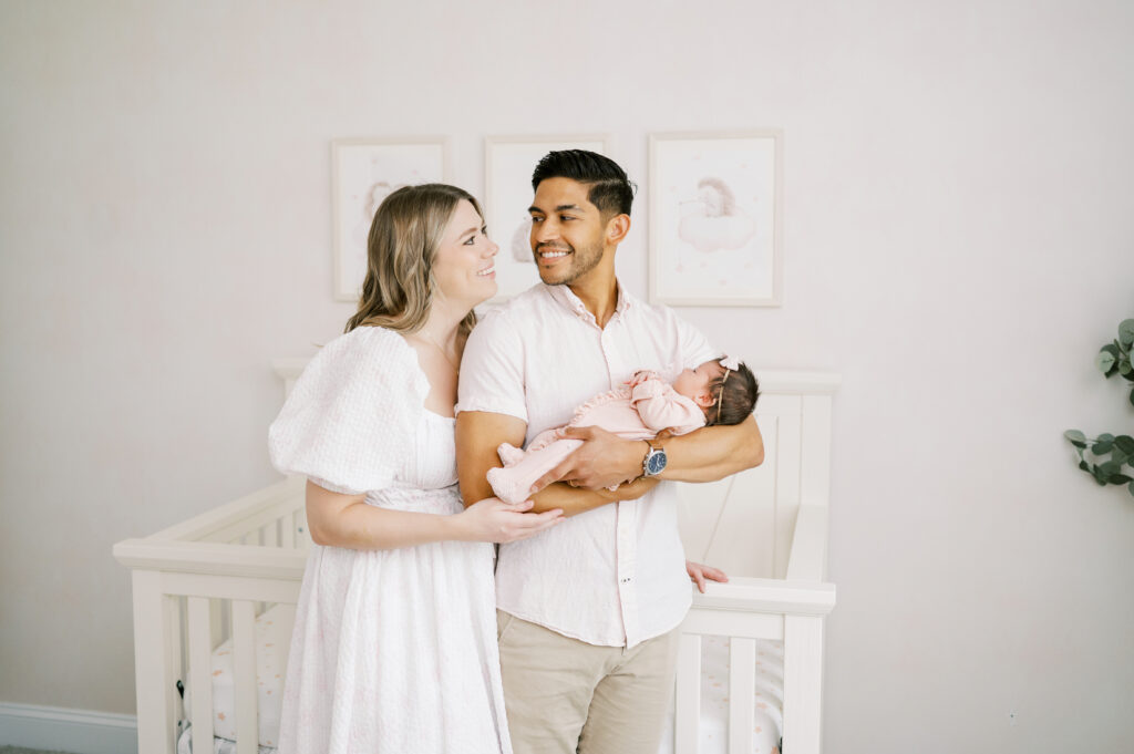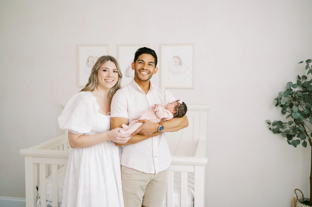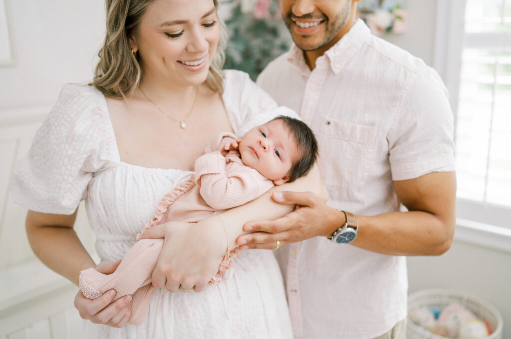 After capturing this sweet couple’s stunning maternity photos in the Raleigh Rose Garden, I was so excited to see them again—this time in their home—to meet their beautiful baby girl. Her session felt extra special, surrounded by the cozy familiarity of her nursery and her parents’ bright, airy bedroom. With the most adorable pink accents decorating her nursery, everything was perfectly styled for such a precious family milestone. Their little one slept soundly through it all, making it possible to capture a wonderful variety of images—snuggles with each parent, sweet family moments together, and timeless portraits that tell the story of their new chapter as a family of three.