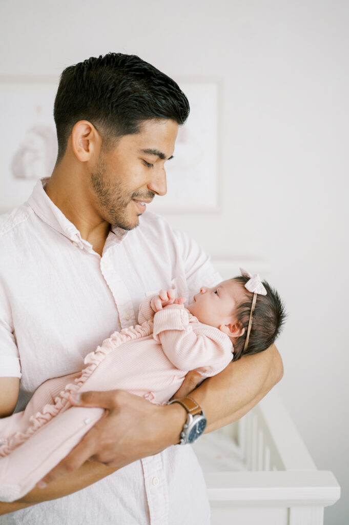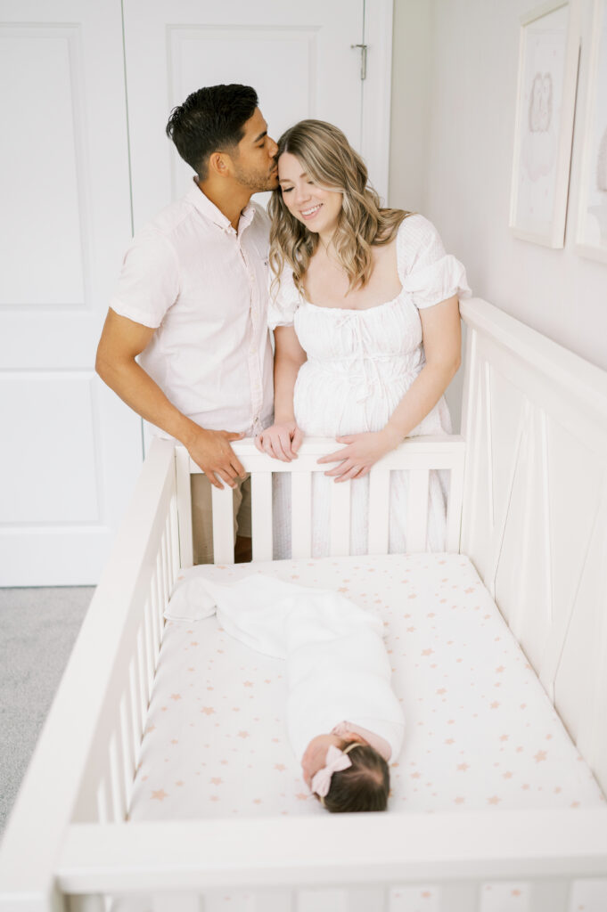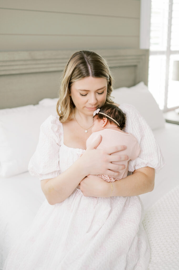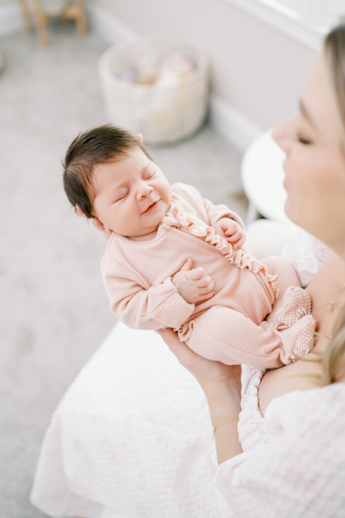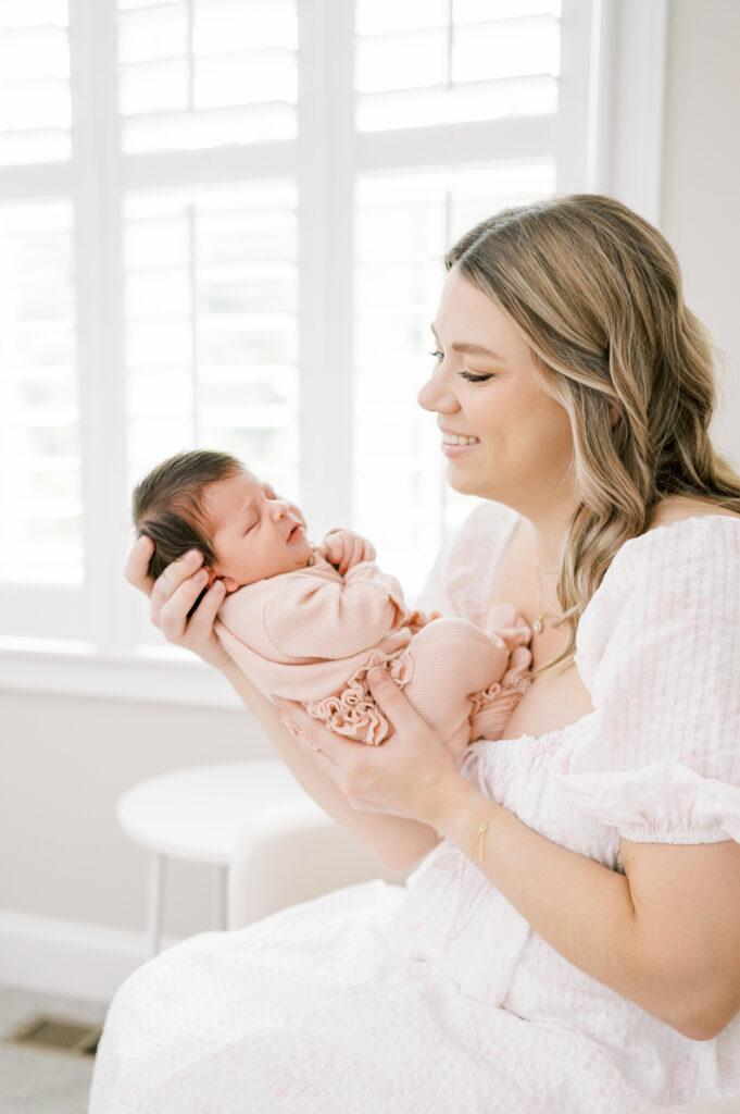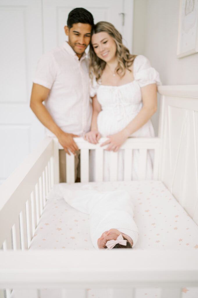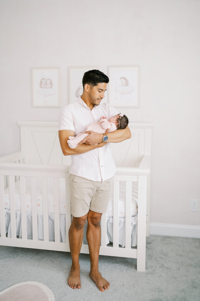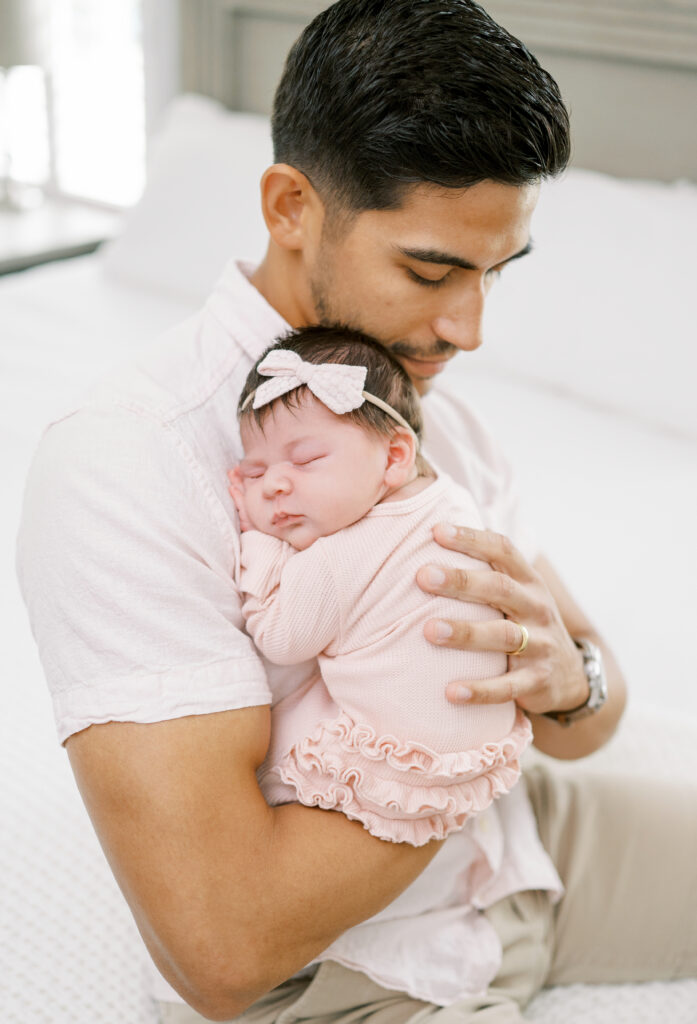 After capturing this sweet couple’s stunning maternity photos in the Raleigh Rose Garden, I was so excited to see them again—this time in their home—to meet their beautiful baby girl. Her session felt extra special, surrounded by the cozy familiarity of her nursery and her parents’ bright, airy bedroom. With the most adorable pink accents decorating her nursery, everything was perfectly styled for such a precious family milestone. Their little one slept soundly through it all, making it possible to capture a wonderful variety of images—snuggles with each parent, sweet family moments together, and timeless portraits that tell the story of their new chapter as a family of three.
