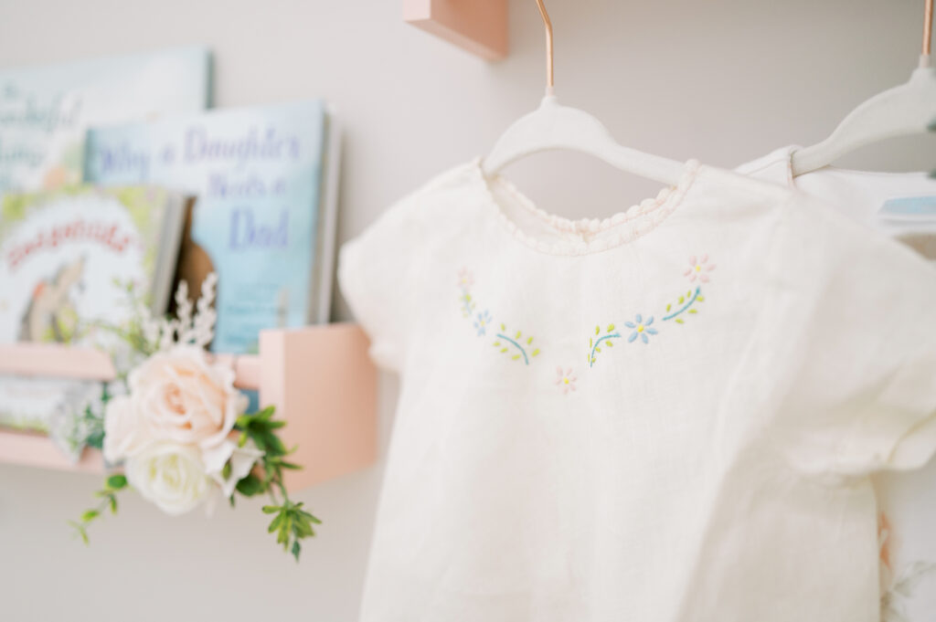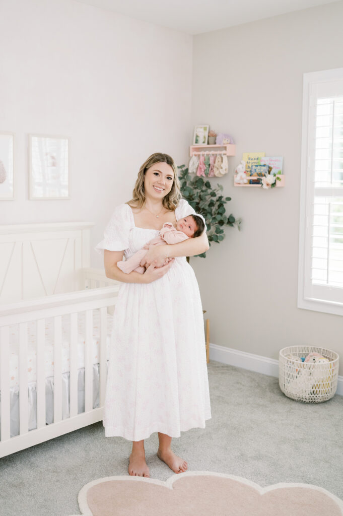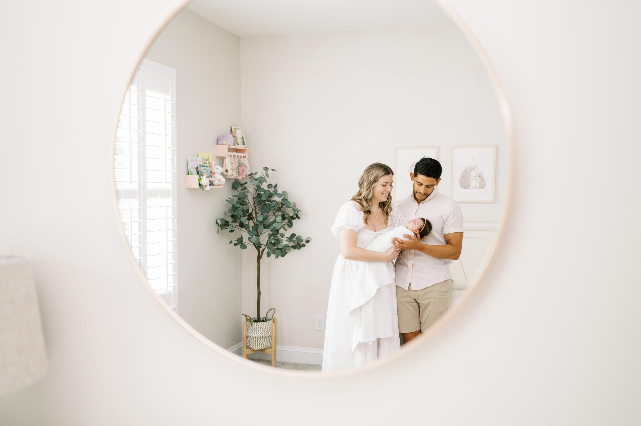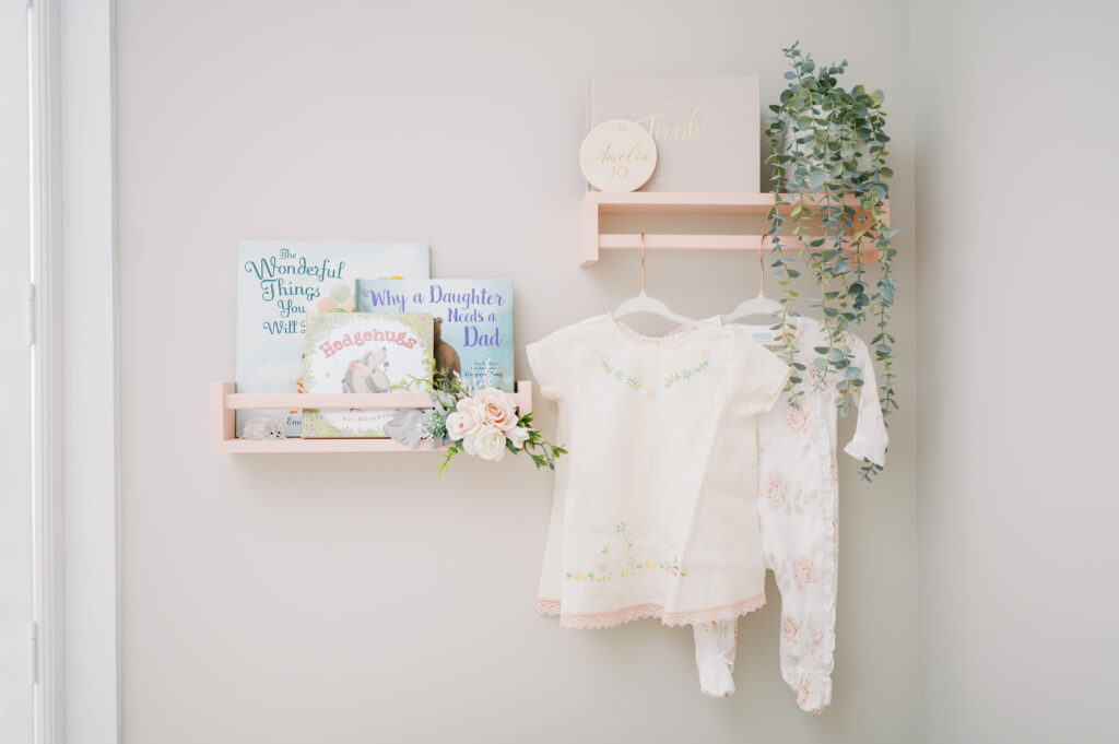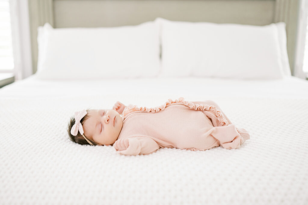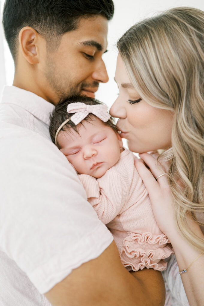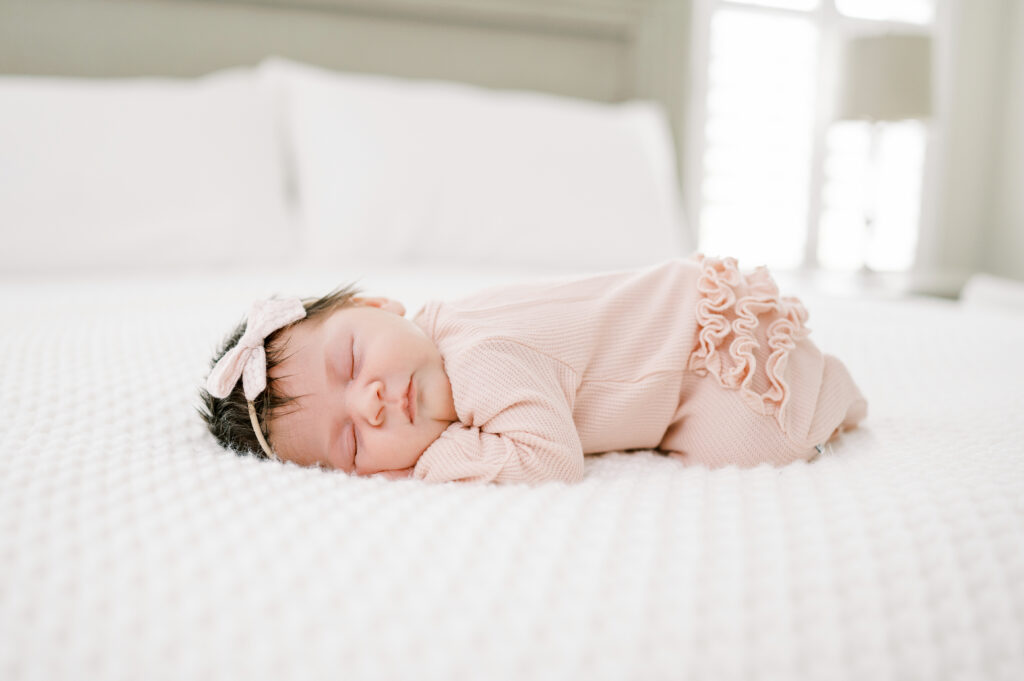 After capturing this sweet couple’s stunning maternity photos in the Raleigh Rose Garden, I was so excited to see them again—this time in their home—to meet their beautiful baby girl. Her session felt extra special, surrounded by the cozy familiarity of her nursery and her parents’ bright, airy bedroom. With the most adorable pink accents decorating her nursery, everything was perfectly styled for such a precious family milestone. Their little one slept soundly through it all, making it possible to capture a wonderful variety of images—snuggles with each parent, sweet family moments together, and timeless portraits that tell the story of their new chapter as a family of three.