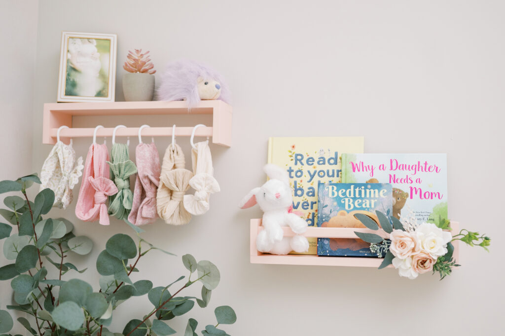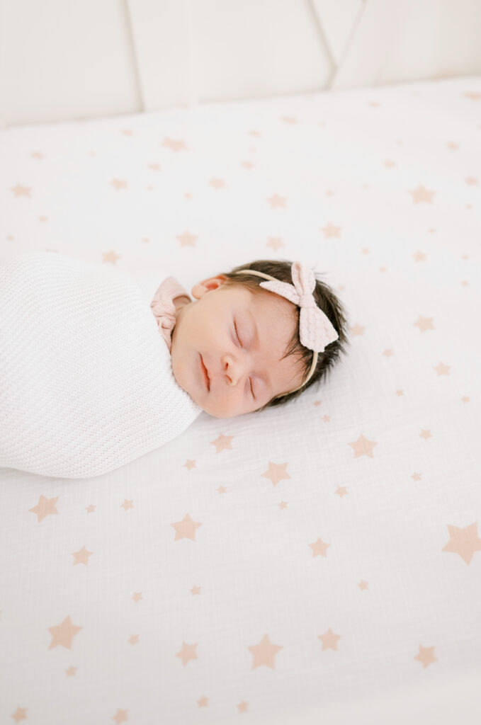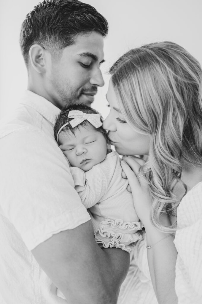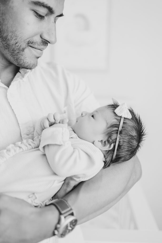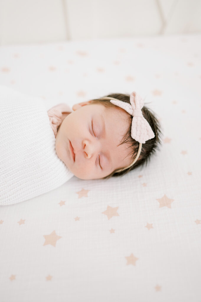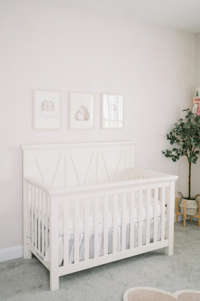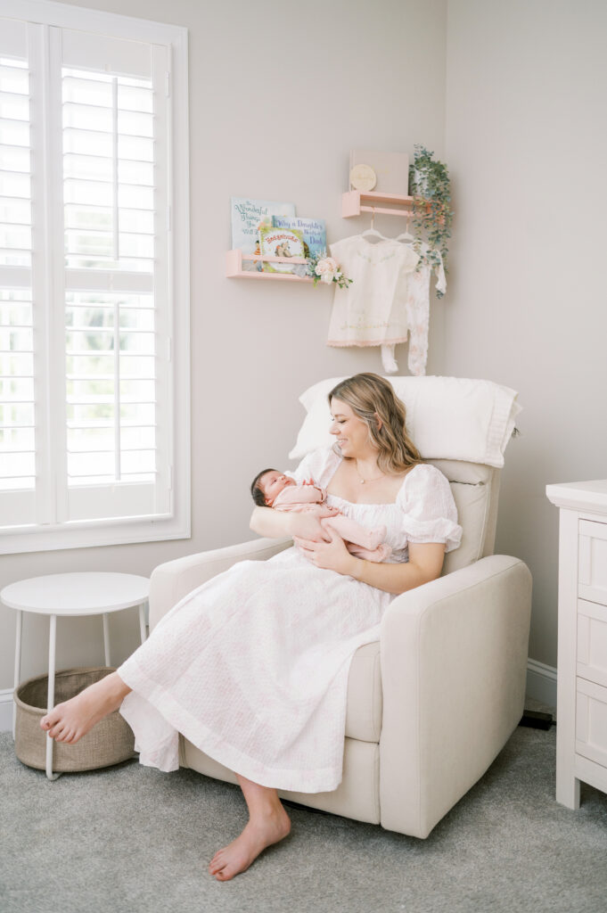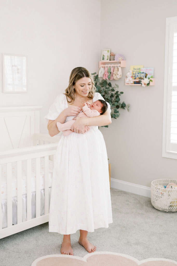 After capturing this sweet couple’s stunning maternity photos in the Raleigh Rose Garden, I was so excited to see them again—this time in their home—to meet their beautiful baby girl. Her session felt extra special, surrounded by the cozy familiarity of her nursery and her parents’ bright, airy bedroom. With the most adorable pink accents decorating her nursery, everything was perfectly styled for such a precious family milestone. Their little one slept soundly through it all, making it possible to capture a wonderful variety of images—snuggles with each parent, sweet family moments together, and timeless portraits that tell the story of their new chapter as a family of three.